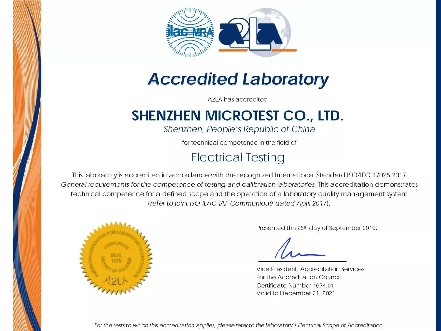 Microtest微測檢測A2LA資質證書編號:4674.01