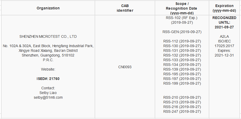 2019年9月27日,微測檢測通過加拿大創新、科技和經濟發展局(ISED)審批,正式成為ISED認可實驗室(認可編號ISED#:21760),是中國地區首批獲得該授權的實驗室之一。
